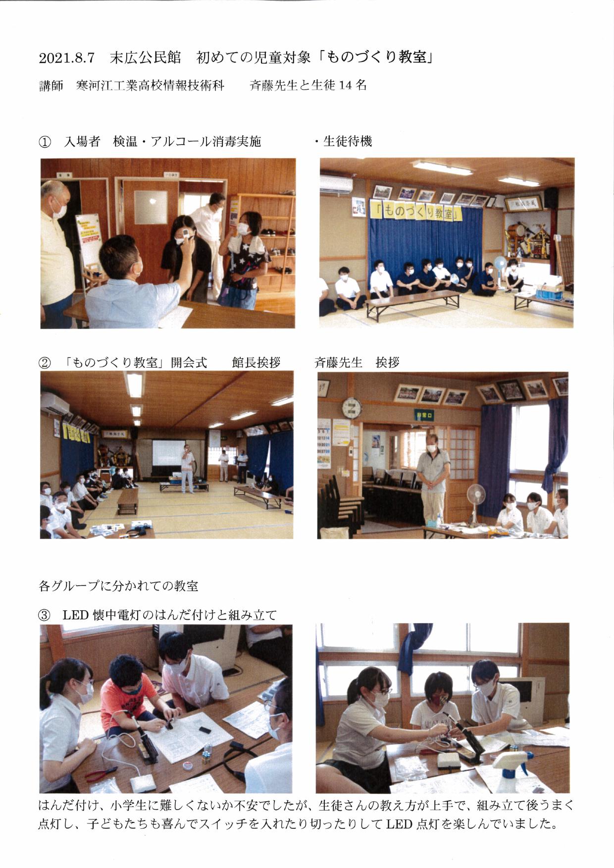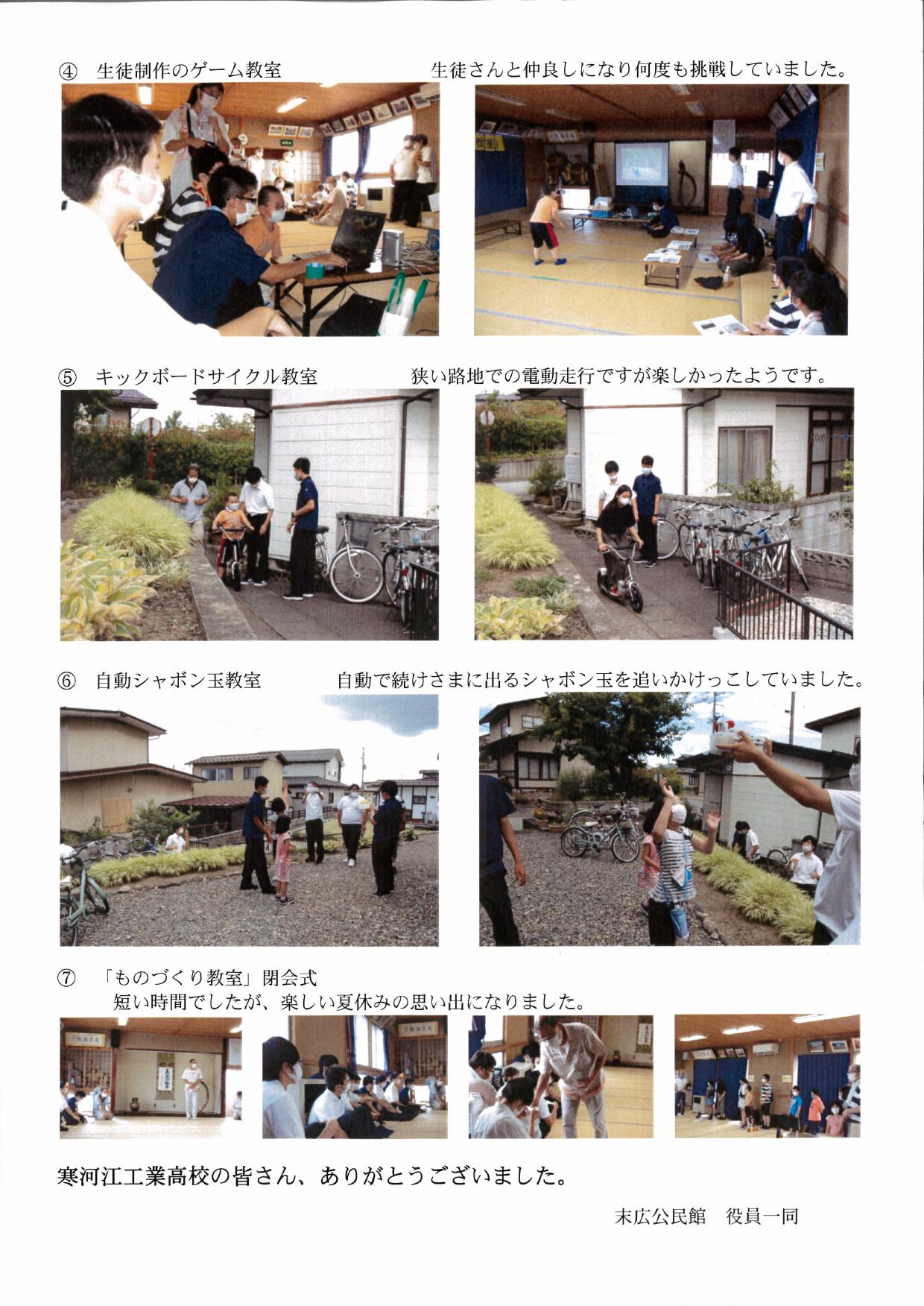 2021年8月25日 11時06分8月7日(土)に寒河江市末広公民館にて本校情報技術科の先生と生徒が講師として、児童対象のものづくり教室を行いました。内容は「LED懐中電灯のはんだ付けと組み立て」、「生徒制作のゲーム教室」、「キックボードサイクル教室」、「自動シャボン玉教室」を行いました。参加した児童はものづくりに大変興味を持ったようでした。ものづくり教室の様子を末広公民館役員様で作成いただきました。